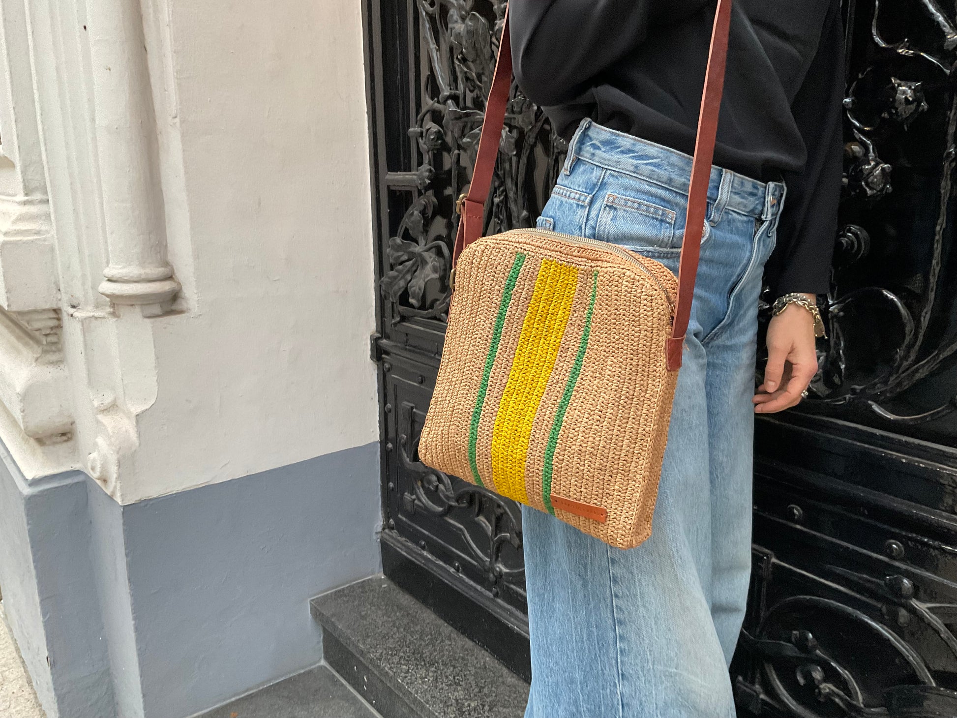Tasche Raffia Umhängetasche mit Ledergurt längenverstellbar. Farbe Natur mit Grün & Gelb abgesetzt. Verschließbar mit einem Reisverschluss. Perfekt für ein Tablet geeignet.